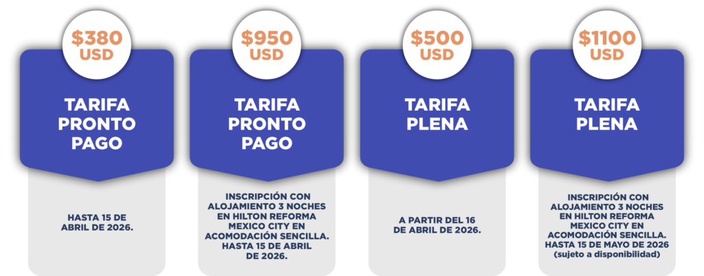 • Moneda de Pago: Le recordamos que el pago de la inscripción al congreso se efectuará en dólares estadounidenses (USD), y se aplicará la tasa de cambio vigente el día de la transacción.